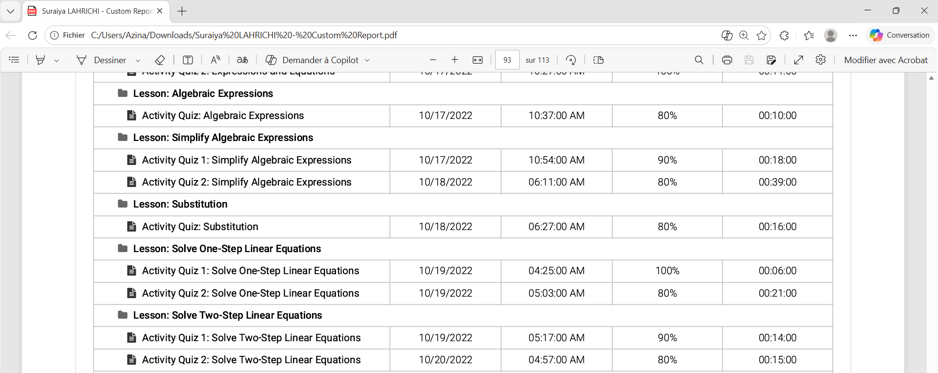 J’avais bien progressé dans ce cours d’algèbre de Time4Learning en apprenant de nouvelles compétences et en les appliquant à travers des activités telles que la résolution d’équations et la création de graphiques. J’ai expérimenté différents concepts mathématiques et mené des recherches sur leurs applications concrètes. J’ai tenu un journal pour suivre mes progrès et partagé mes défis ou réalisations avec mon directeur. Cela m’aide à garantir que je respecte les exigences du cours et permet des retours précieux.