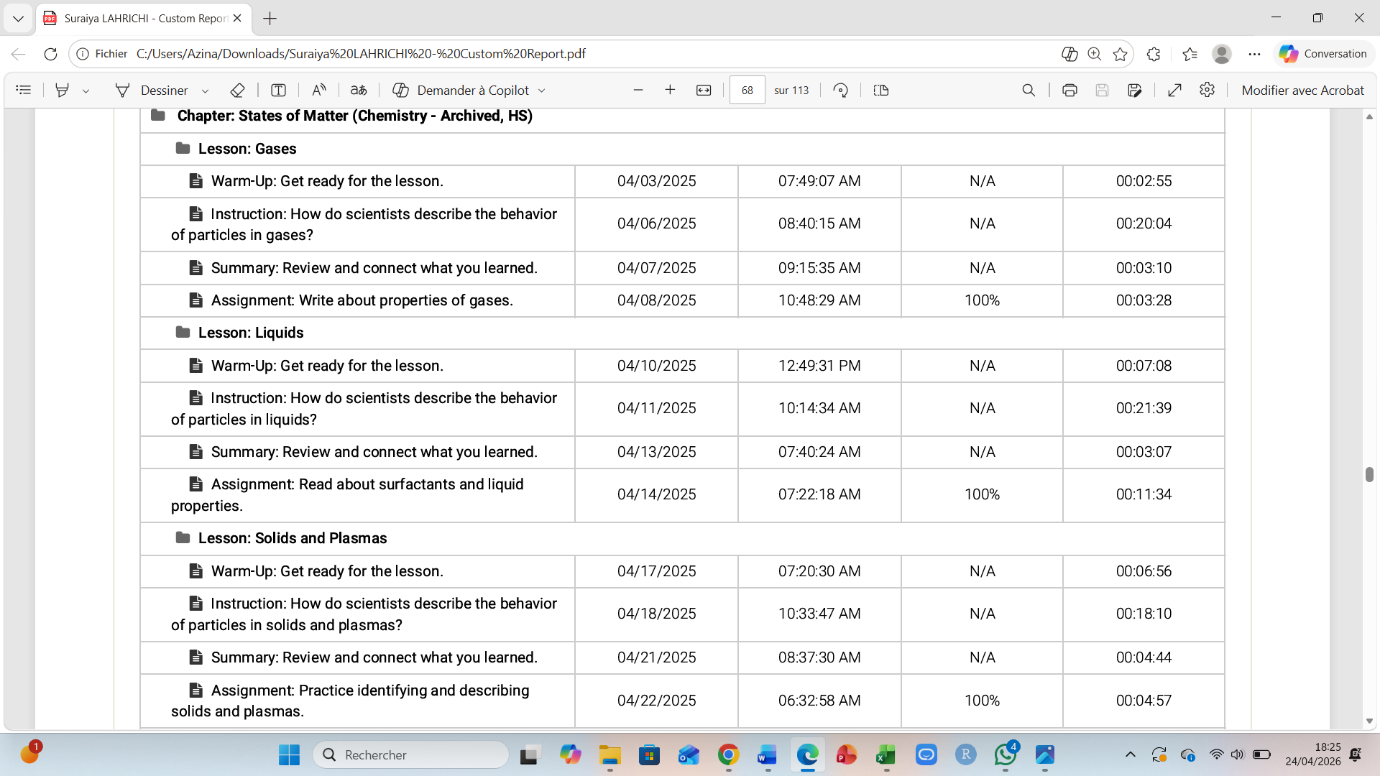 Je suis également inscrit en chimie avec mention et j’ai beaucoup progressé grâce à l’AP Chemistry de la Khan Academy ainsi qu’au cours complet de chimie Edgenuity. J’ai étudié la composition, les propriétés, les changements et les interactions de la matière. J’ai réalisé des expériences en laboratoire virtuel qui encouragent des applications de pensée d’ordre supérieur. Les composantes de ces cours incluent la composition et les propriétés de la matière, les changements et interactions de la matière, la chimie organique et la chimie nucléaire.