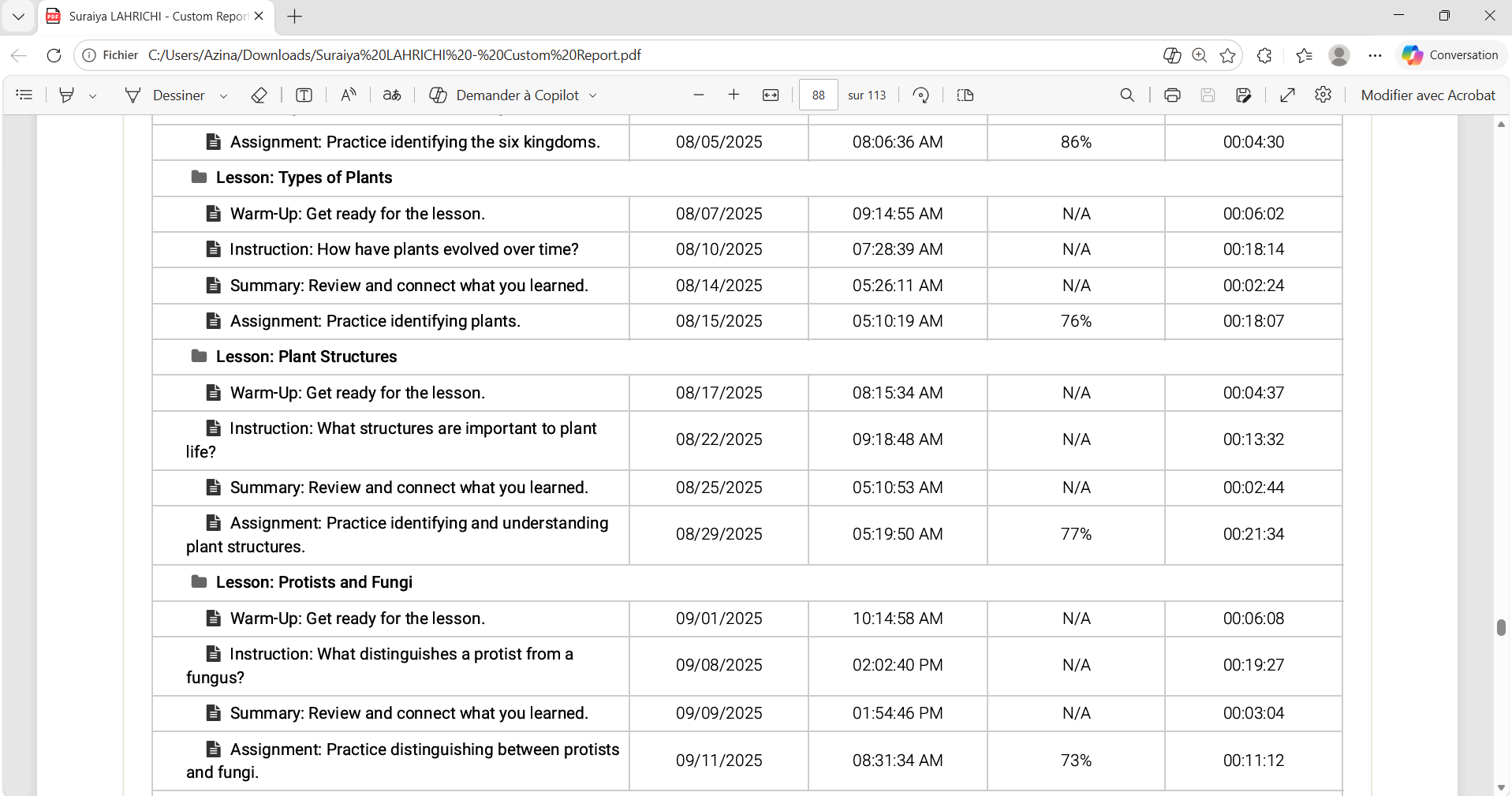 J’ai travaillé en SVT à un niveau avancé pour obtenir des mentions dans ce domaine, en explorant des chapitres tels que Écologie, Les Blocs de Construction de la Vie, Biologie Cellulaire, Processus Cellulaires, Génétique Moléculaire, Hérédité, L’Évolution de la Vie, Taxonomie, Le Corps Humain I et Le Corps Humain II. Un groupe diversifié d’enseignants expérimentés m’a guidé tout au long du programme à travers des conférences vidéo et des devoirs. L’accent mis sur l’interprétation des chiffres et l’affichage des données a renforcé ma compréhension des informations présentées de manière scientifique. Comme ces cours étaient principalement en ligne sur Time4Learning et Khan Academy, j’ai suivi un bon nombre de cours, d’exercices et de devoirs avec de bonnes notes. J’ai pu faire des laboratoires virtuels en ligne via la plateforme Edgenuity, ce qui est un bon ajout à mes observations et expériences réelles.